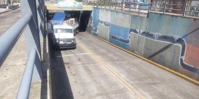 El vehículo con acoplado, con una altura que supera la permitida para el bajo nivel, quedó cruzado en el tunel.