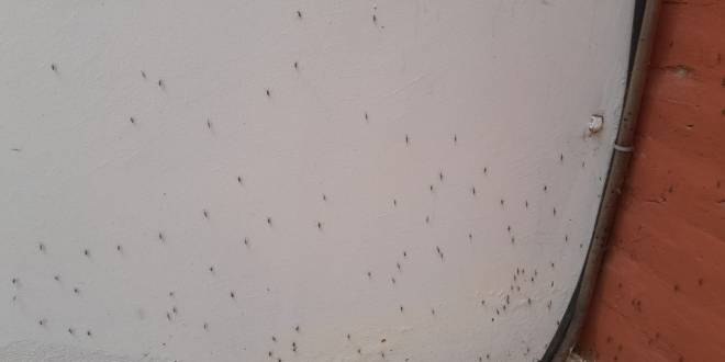Quilmes y el conurbano bonaerense están afectados por una impresionante invasión de mosquitos. Desde anoche, se los puede ver en paredes exteriores y en los techos de los distintos ambientes, principalmente a la altura de puertas y ventanas.