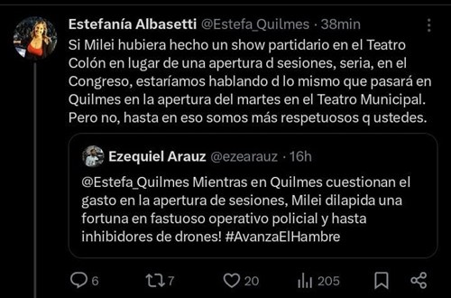«Si Milei hubiera hecho un show partidario en el Teatro Colón en lugar de una apertura d sesiones, seria, en el Congreso, estaríamos hablando d lo mismo que pasará en Quilmes en la apertura del martes en el Teatro Municipal. Pero no, hasta en eso somos más respetuosos q ustedes», le respondió por la misma vía Albasetti a Arauz.