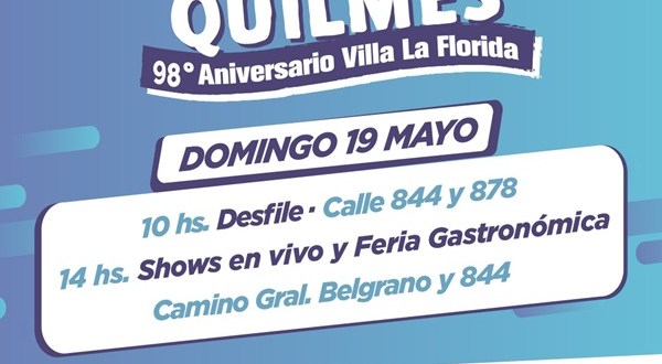 El Municipio de Quilmes invita a los vecinas y vecinas a participar de la celebración del 98º aniversario de Villa La Florida, a realizarse el próximo domingo 19 de mayo, que tendrá el tradicional desfile, una feria gastronómica y de emprendedores y una nueva edición del festival Somos Quilmes, con shows en vivo.