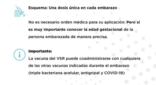 Para su aplicación no es necesario la orden médica, pero sí conocer la edad gestacional de la persona embarazada de forma precisa, y puede coadministrarse con cualquiera de las otras vacunas indicadas durante el embarazo (triple bacteriana acelular, antigripal y COVID-19).