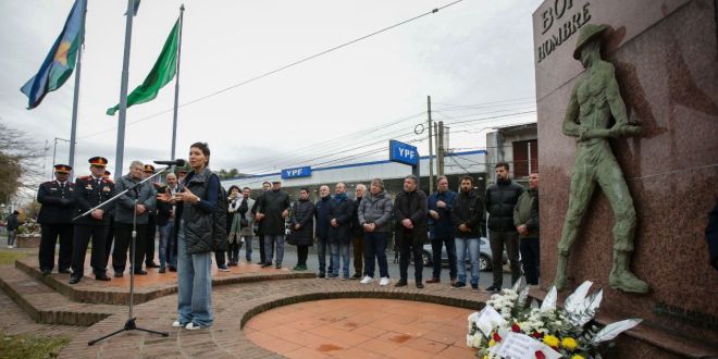 Durante el evento, la Intendenta y los 4 presidentes de las asociaciones de Bomberos Voluntarios de la comuna colocaron ofrendas florales en el monumento al Bombero Hombre Titán, que se encuentra en la plazoleta sobre avenida Dardo Rocha, frente al cuartel.