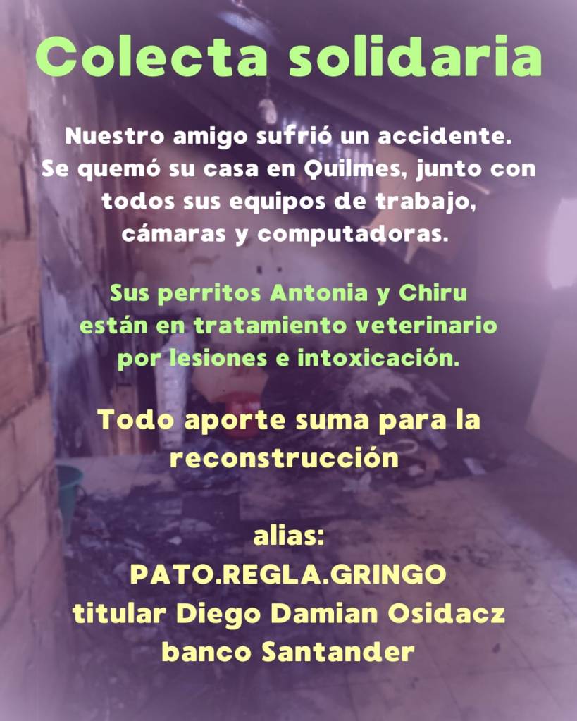 Diego Osidacz es fotógrafo, camarógrafo y editor audiovisual. El jueves pasado, feriado por el Día de la Bandera, su casa se incendió y perdió todos sus equipos de trabajo. Una de sus cuatro mascotas murió y las otras tres tuvieron que ser asistidas por inhalar monóxido de carbono.