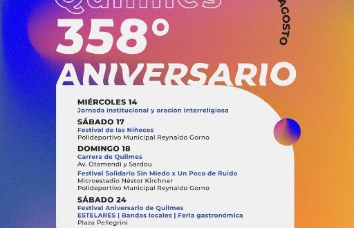 Durante agosto se llevará adelante el “Mes de Quilmes”, con motivo del 358º aniversario de la ciudad que se celebra el 14 de agosto, y que contará con distintas actividades sociales, culturales, deportivas y de espectáculos con entrada libre y gratuita para toda la familia, hasta el sábado 24, con una nueva edición del Festival Somos Quilmes, con el cierre de Estelares.