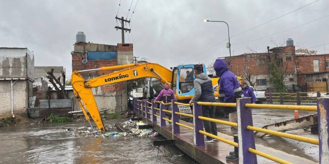 En este contexto, con los arroyos al límite, las cuadrillas municipales trabajan en los puntos críticos, desobstruyendo los cauces con maquinaria pesada y camiones batea en el cruce con la avenida 850 para que el agua fluya a buen ritmo.