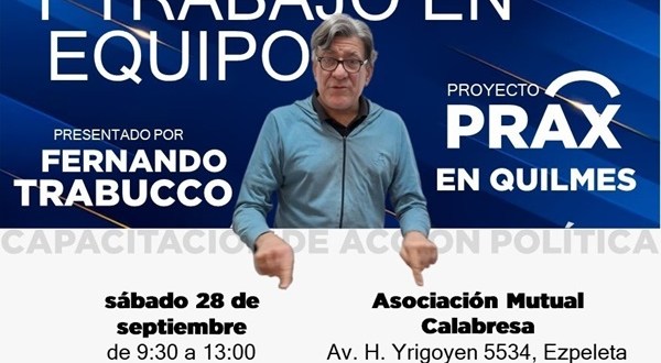 El próximo sábado 28 de septiembre, de 9.30 a 13, se llevará a cabo el Taller de Formación Política: Liderazgo y Trabajo en Equipo en la Asociación Mutual Calabresa (Av. H. Yrigoyen 5534, Ezpeleta). Esta capacitación de acción política será dictada por Fernando Trabucco, especializado en coaching y desarrollo profesional, y fundador del Proyecto Prax, una iniciativa que ha presentado diversas propuestas formativas en varios distritos de la Provincia de Buenos Aires a lo largo del año.