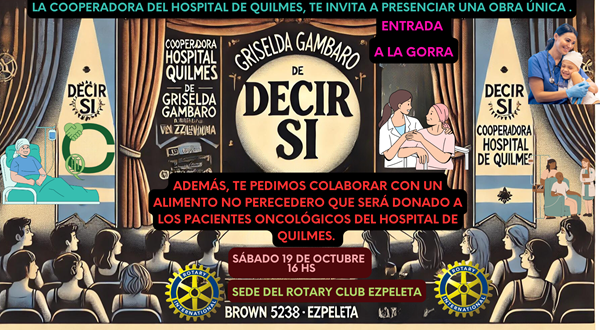La Cooperadora del Hospital de Quilmes invita a toda la comunidad a asistir a la función de la obra de teatro “Decir sí”, una pieza que, a través de la sátira, aborda con profundidad y sensibilidad la temática del último golpe militar y la importancia de vivir en un sistema democrático. La presentación se llevará a cabo el próximo sábado 19 de octubre en la Sede del Rotary Club Ezpeleta, ubicada en Brown 5238.