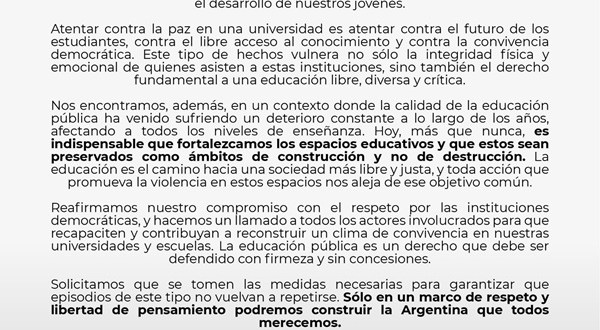 Las instituciones educativas son el pilar de una sociedad democrática, donde el debate de ideas y el respeto mutuo deben prevalecer por sobre cualquier tipo de confrontación o agresión. La violencia, en cualquiera de sus formas, no tiene cabida en un ámbito cuyo propósito es la formación académica, el crecimiento intelectual y el desarrollo de nuestros jóvenes», señala el comunicado.