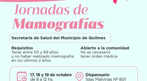 En primera instancia, el 17, 18 y 19 de octubre se realizarán jornadas de mamografías de 8 a 12, en el Instituto Municipal de Medicina Preventiva Dr. Ramón Carrillo (ex Dispensario), ubicado en Marcelo T. Alvear esquina Islas Malvinas, en Quilmes Oeste, que están dirigidas a mujeres de entre 50 y 69 años que no se hayan realizado ese estudio en los últimos dos años. Este servicio es abierto a la comunidad y gratuito, con atención por orden de llegada y sin necesidad de orden médica.