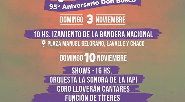 El domingo 3 de noviembre la Comisión de Festejos de las Instituciones de la Ciudad de Don Bosco invita al acto conmemorativo del 95º aniversario de Don Bosco, que se llevará adelante desde las 10, en la plaza Manuel Belgrano, ubicada en las calles Pringles, Chaco y Lavalle, con el acompañamiento de la Comuna.
