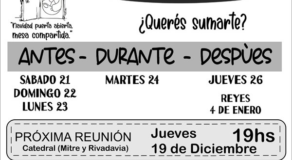 En esta oportunidad se invita especialmente a las personas que puedan sumarse como servidoras antes, durante o después de la Cena (para servir la mesa, para preparar viandas, para transportar mercaderías y para llevar a personas, entre otras posibilidades) a que participen de la reunión en la que se realizará el jueves 19 de diciembre a las 19 h en el Salón parroquial de la Iglesia Catedral de Quilmes (Rivadavia 355, Quilmes Centro).