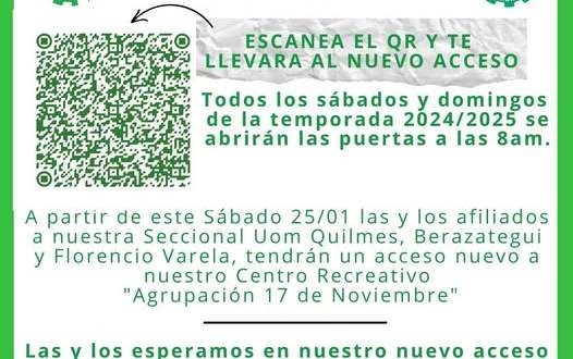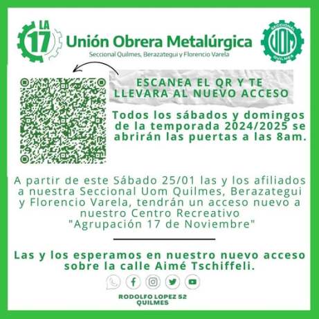 Desde hoy, los afiliados y afiliadas de la seccional UOM (Unión Obrera Metalúrgica) seccional Quilmes, Varela y Berazategui tendrán acceso exclusivo al Centro Recreativo «Agrupación 17 de Noviembre».