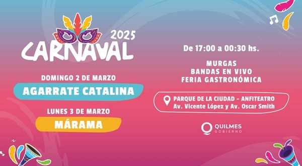 El cierre de los festejos del Carnaval 2025 se llevarán a cabo el próximo domingo 2 y lunes 3 de marzo de 17 a 0.30, con entrada libre y gratuita, en el anfiteatro del Parque de la Ciudad ubicado en la avenidas Vicente López y Smith (Quilmes Oeste) con las presentaciones estelares de la murga Agarrate Catalina y de la banda Márama, además de representantes locales, bandas en vivo y una feria gastronómica con foodtrucks.