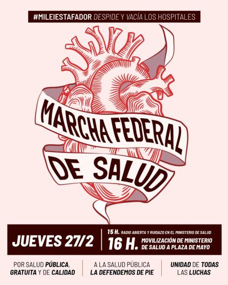 El próximo 27 de febrero se realizará la Marcha Federal de Salud, a las 16, desde el Ministerio de Salud hasta Plaza de Mayo (CABA). La convocatoria surge como resolución de la reunión de coordinación realizada pasado jueves 13 de febrero en el Hospital Garrahan, en la cual participó un centenar de organizaciones de salud.