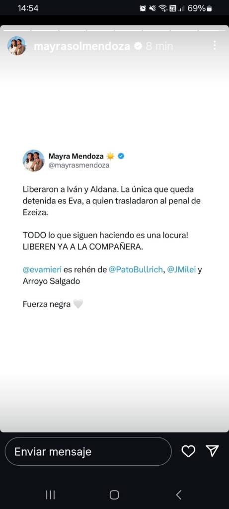 «Liberaron a Ivan y Aldana. La única que queda detenida es Eva, a quien trasladaron al penal de Ezeiza. Todo lo que siguen haciendo es una locura!» Liberen ya a la compañera», expresó la jefa comunal quilmeña y sostuvo que la edil y primera en la línea sucesoria de la intendencia «es rehén de Patricia Bullrrich, Javier Milei y Arroyo Salgado».