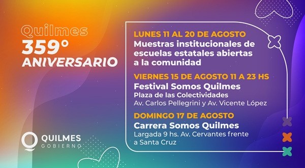 Con motivo del 359º aniversario de la ciudad de Quilmes que se celebrará el próximo jueves 14 de agosto, se llevarán a cabo diferentes propuestas recreativas, deportivas y culturales a lo largo de todo el mes, entre las que se encuentran shows artísticos y musicales en vivo en la plaza De las Colectividades, la Copa Ciudad de Quilmes y la Carrera Somos Quilmes, entre otras.
