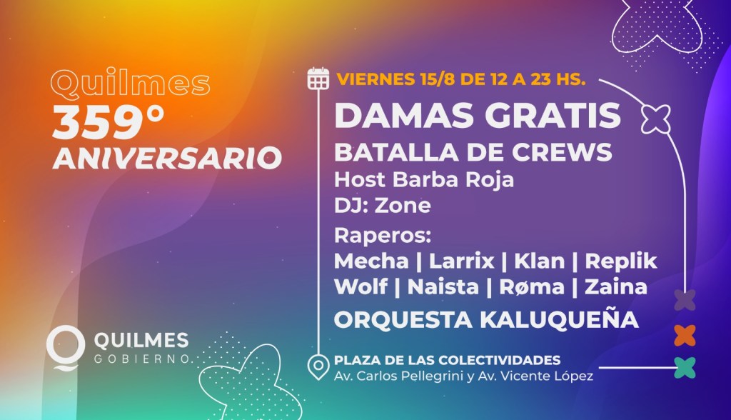 En el marco del 359º aniversario de la ciudad se llevará adelante una nueva edición del Festival Somos Quilmes, que se desarrollará el viernes 15 de agosto, entre las 12 y las 23, y tendrá como cierre estelar la presentación de la reconocida banda de cumbia Damas Gratis, con entrada libre y gratuita.