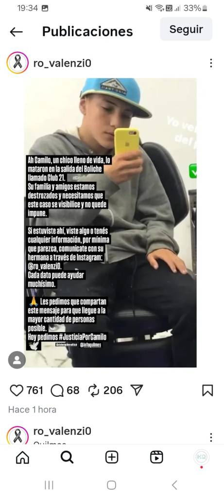 Su hermana expresó: «Camilo, un chico lleno de vida, lo mataron en la salida del boliche Club 21. Su familia y amigos estamos destrozados y necesitamos que éste caso se visibilice y no quede impune».