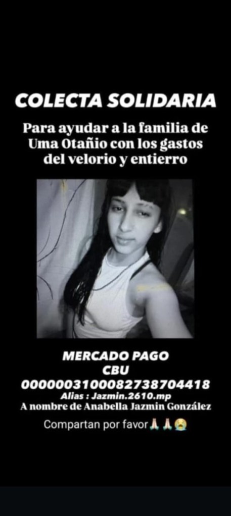 Además, se habilitó una cuenta solidaria para colaborar con los gastos de sepelio, bajo el alias JAZMIN.2610.MP.