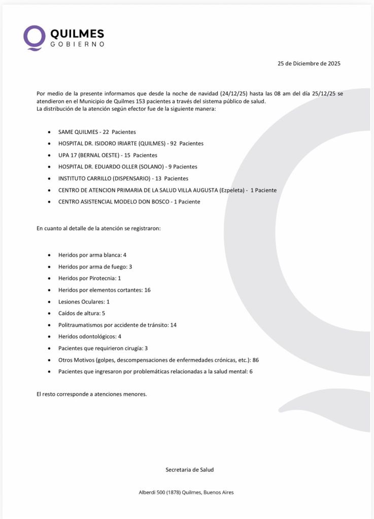 Durante la noche de Navidad y la madrugada del 25 de diciembre, el sistema público de salud del Municipio de Quilmes registró una intensa actividad. Según el informe oficial difundido por la Secretaría de Salud, entre las 22 horas del 24 de diciembre y las 8 de la mañana del 25/12 se atendieron 153 pacientes en distintos efectores sanitarios del distrito.