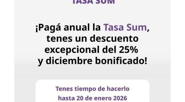El Municipio de Quilmes informa a todos los contribuyentes, que diciembre hasta el 20 de enero se puede realizar el pago anual de la tasa por Servicios Urbanos Municipales (Tasa SUM) con un descuento del 25% sobre el total y la bonificación de la cuota de diciembre.