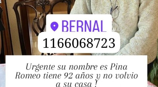 Pina Romeo, la mujer de 92 años que era intensamente buscada desde la mañana de este martes tras salir de su domicilio en Barrio Parque Bernal, apareció sana y salva, según confirmaron sus familiares.