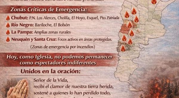 Desde la diócesis convocaron a la comunidad a rezar por las personas afectadas, por quienes combaten los incendios y por el cuidado de la Casa Común, al tiempo que invitaron a colaborar con donaciones económicas destinadas a la asistencia de las familias damnificadas.