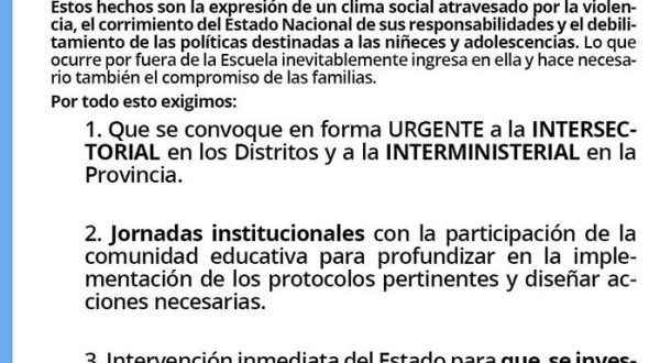 En ese marco, el gremio docente planteó una serie de demandas concretas. Entre ellas, la convocatoria urgente a mesas intersectoriales en cada distrito y a una instancia interministerial a nivel provincial, la realización de jornadas institucionales para reforzar la implementación de protocolos y diseñar nuevas estrategias de prevención, y la intervención del Estado para investigar los delitos cibernéticos vinculados a estas amenazas.