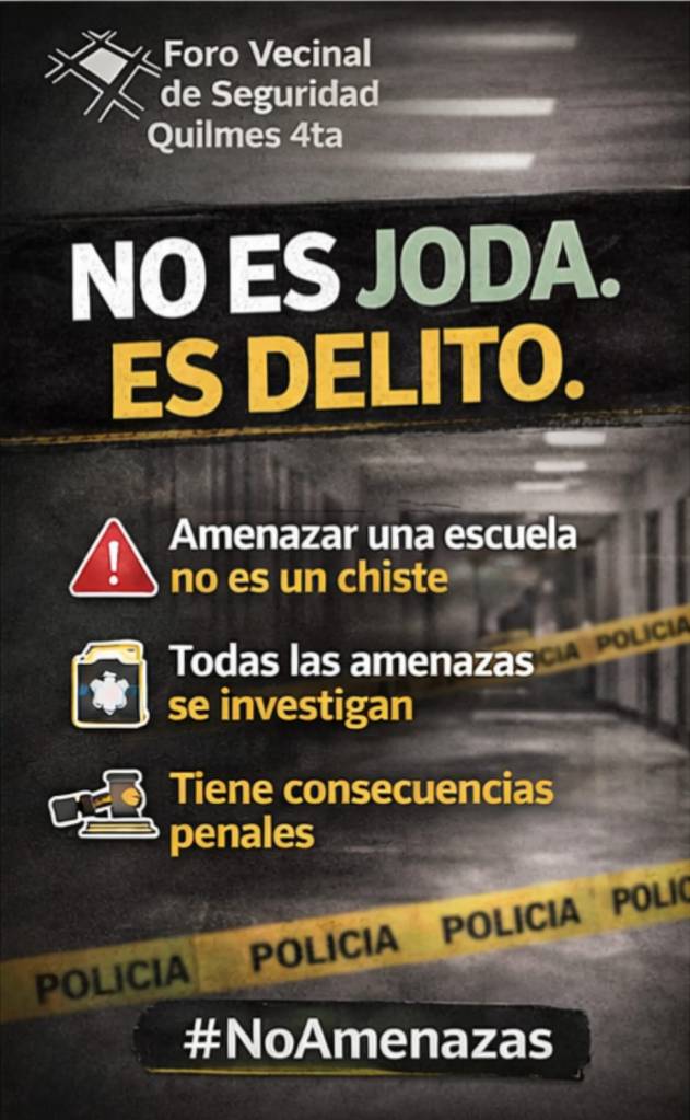 Por su parte, desde el Foro Vecinal de Seguridad Quilmes 4ta (Solano) lanzaron una campaña de concientización bajo el lema “No es joda. Es delito”, recordando que este tipo de amenazas no son bromas y tienen consecuencias penales. Además, insistieron en la importancia de no viralizar los mensajes y de informar inmediatamente a adultos responsables o autoridades escolares.